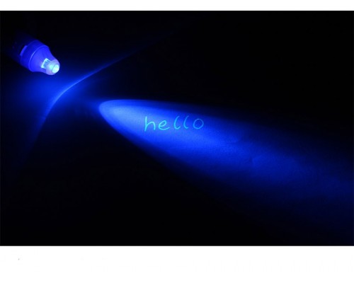 Ручка с невидимыми чернилами и ультрафиолетовым фонариком позволит нанести надписи ультрафиолетовыми чернилами, которые невидимы при обычном освещении, и подсветить эти надписи встроенным УФ-фонариком. Отличный подарок детям для игр, а также для новогодних игр, вечеринок и мероприятий в вечернее ночное время и в затемнённых помещениях. Можно пометить деньги, нанести метки на тело, подарочную надпись на день рождения и т.п. Длина ручки: 13 см, толщина линии: 1,5 мм.